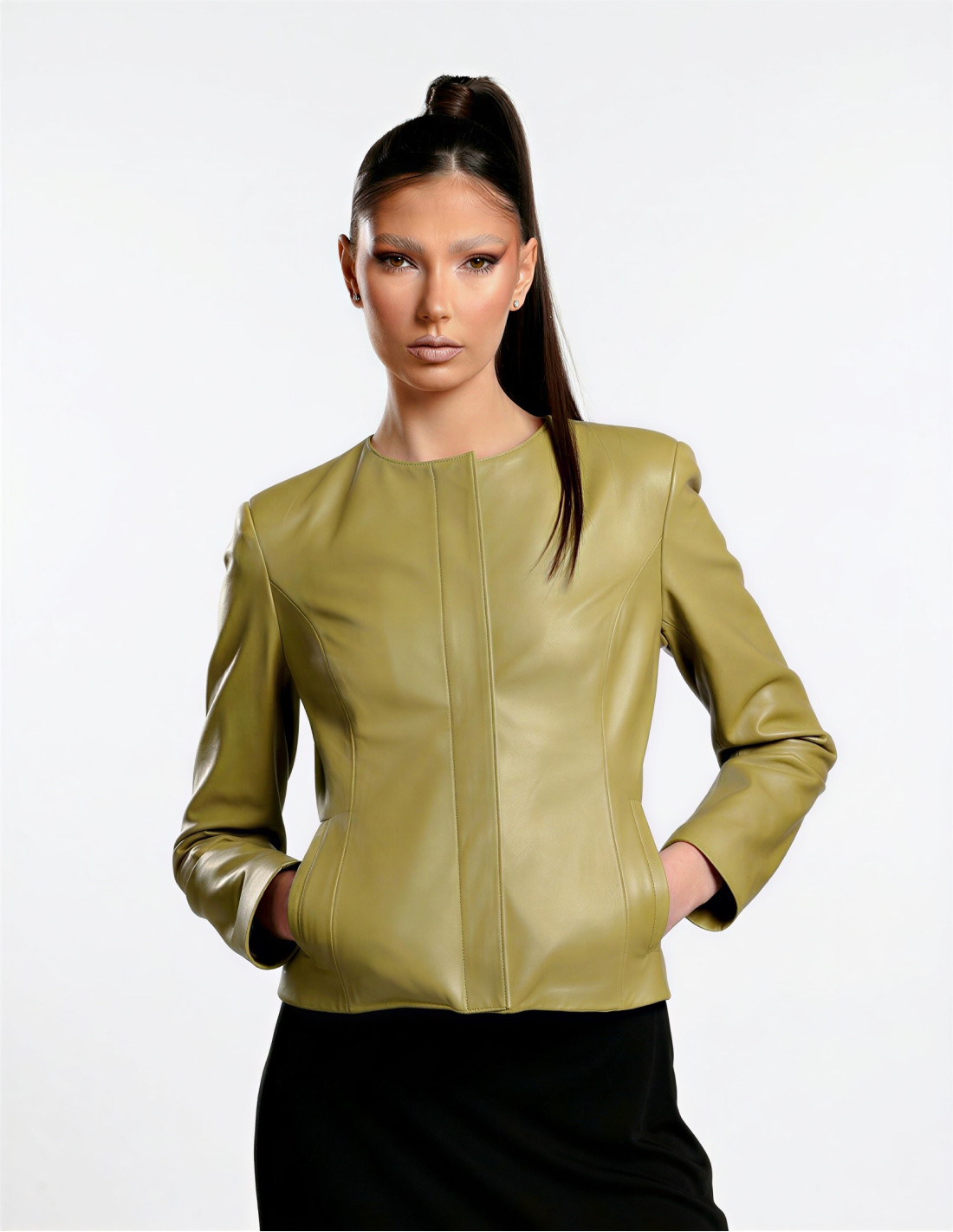 - Geacă din piele naturală de miel, croială cambrată, simplă, fără guler.