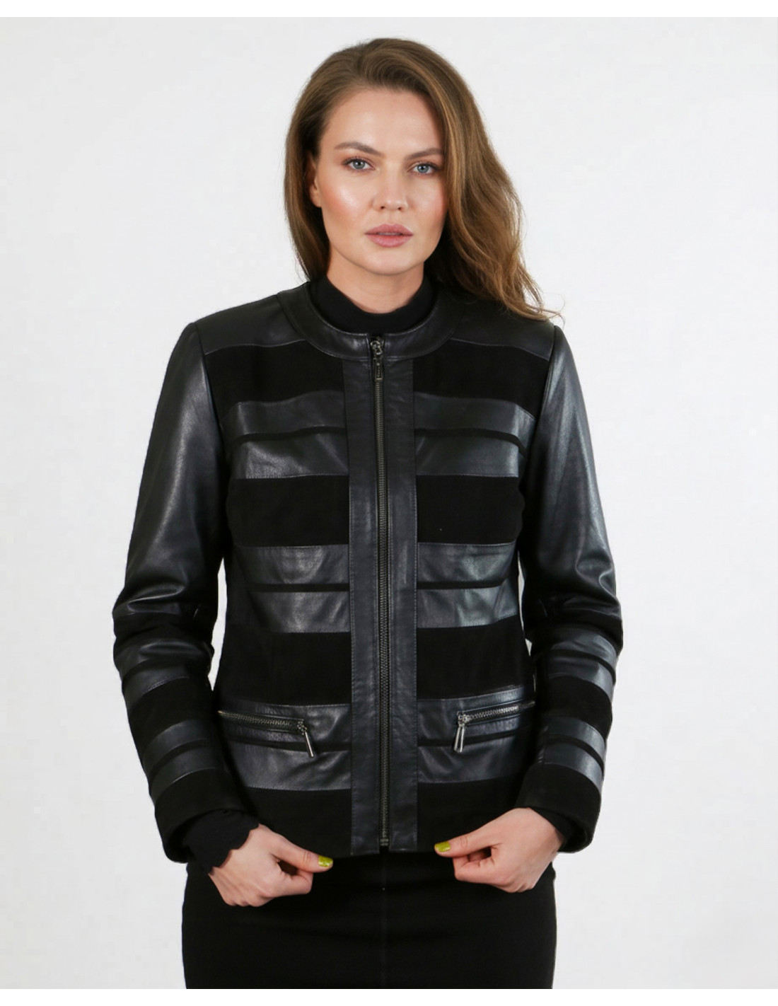Geaca Caterina 04 este expresia perfectă a rafinamentului urban, combinând pielea naturală de miel nappa cu accente de velur pentru un efect vizual elegant. Este o piesă versatilă, ce adaugă un plus de stil oricărei garderobe.