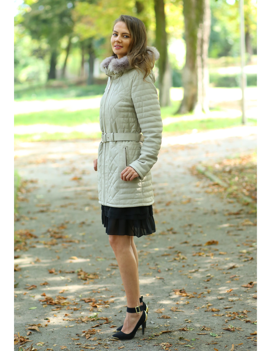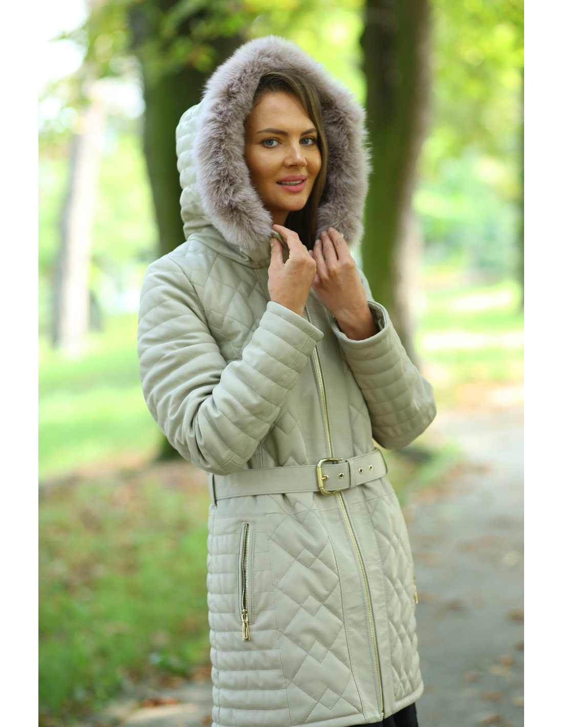 Geacă de Damă Matlasată Din Piele de Miel și Guler din Vulpe Argintie Model Dalia Crem